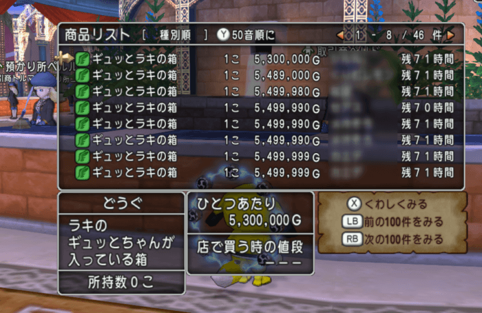 ギュッとラキの箱  ギュッと主神ラキの箱の初日のバザー価格は約530万Gでした!
