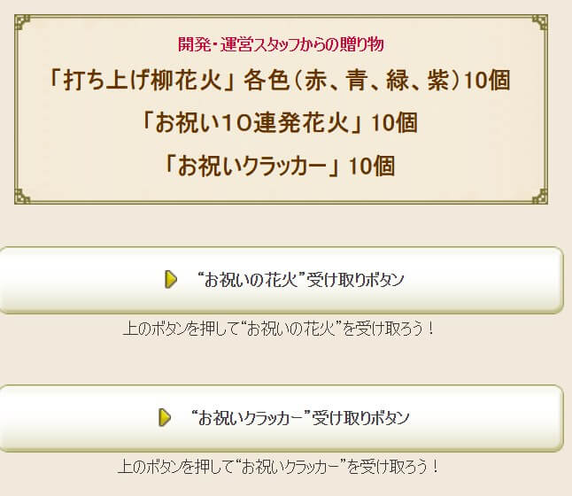 冒険者の広場のイベントページで「打ち上げ柳花火」 各色(赤、青、緑、紫)10個 「お祝い10連発花火」 10個 「お祝いクラッカー」 10個を受け取れます!