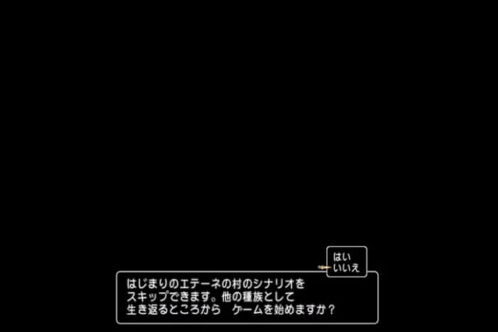 しかし、提案で問題になってるシーンが上記で「はじまりのエテーネの村のシナリオをスキップできます。他の種族として生き返るところからゲームを始めますか?」という盛大なネタバレが行われてるみたいです><
