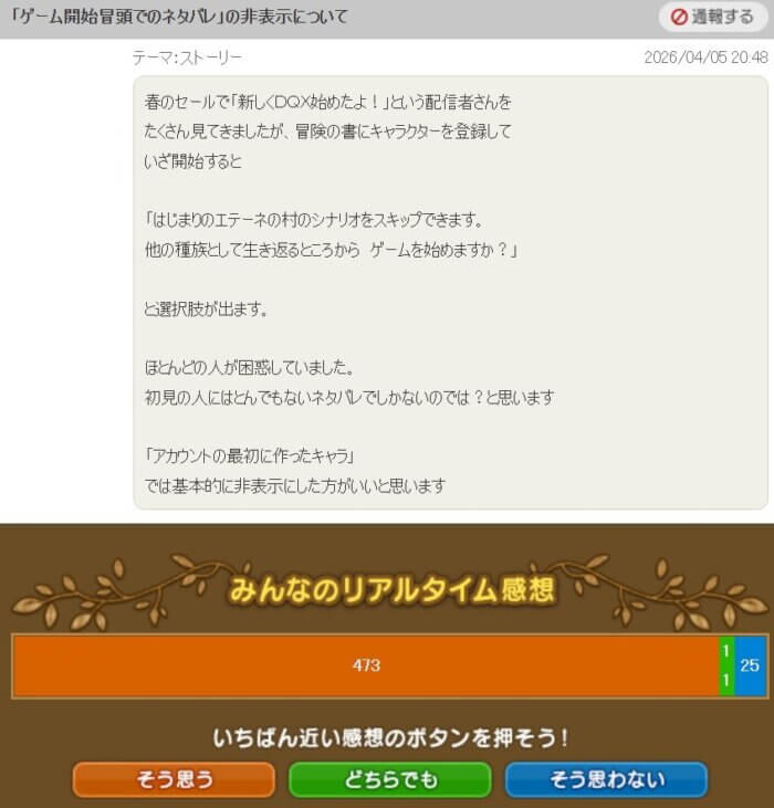 配信者が新しくDQX始めたのをたくさん見てきましたが、ゲーム開始冒頭のネタバレでほとんどの人が困惑してた。ネタバレを非表示にしたほうが良いと思う」という提案です。