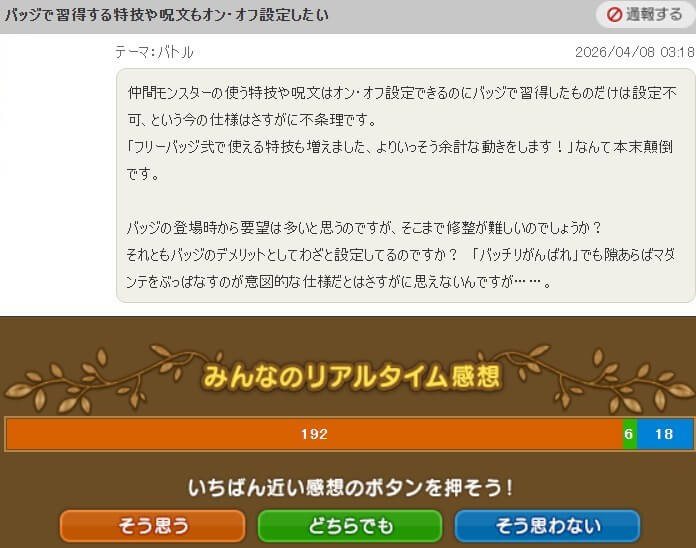 「仲間モンスターの特技・呪文はオン・オフ設定できるのに、バッジの特技・呪文は設定不可とういうのは不条理。設定できるようにしてほしい」という提案です。