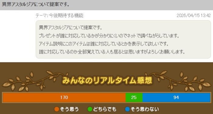 「異界アスタルジアのプレゼントが誰に対応してるのか分かりにくいのでネットで調べながらしてる。誰に対応してるか分かりやすくしてほしい」という提案です。